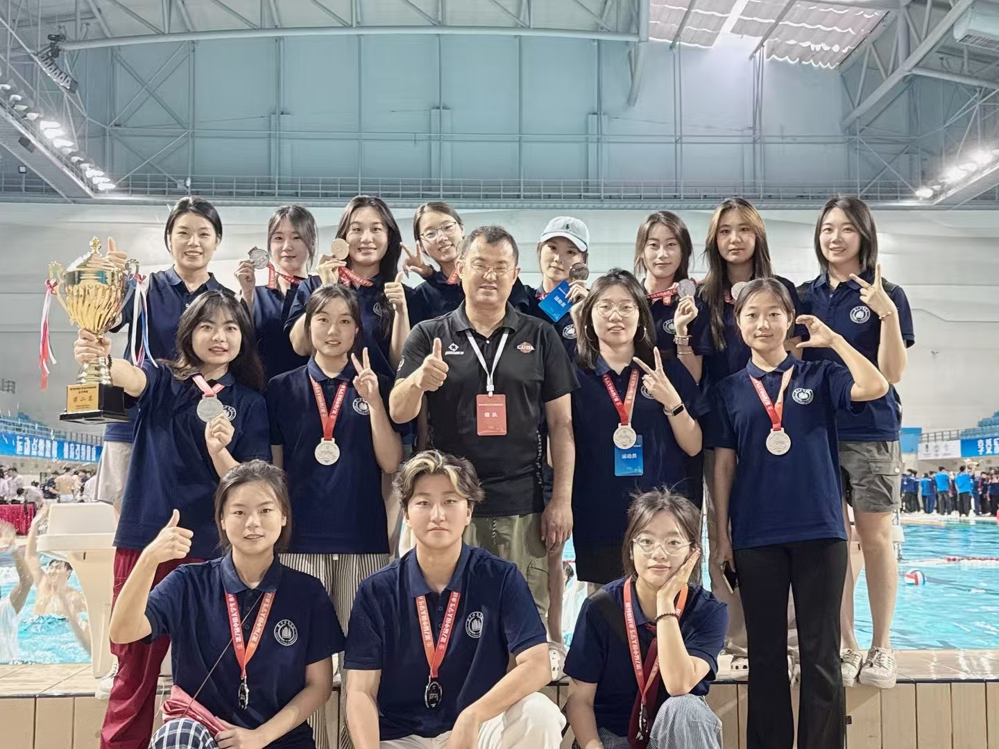 这一年,我们乘胜追击:在第七届中国大学生水球锦标赛中首夺女子甲组亚军,队伍获“体育道德风尚运动队”称号;在山西省学生游泳锦标赛中,以总分328分拿下大学校园组团体第一名,斩获12金7银5铜并打破两项校记录,看着学生们从“怕水的小白”变成“敢拼的健将”,看着学校水上项目实现“从无到有、从弱到强”的跨越,我知道:所有清晨6点的泳池晨光,所有寒冬里冻红的拍打墙球的指尖,都值得!